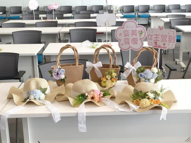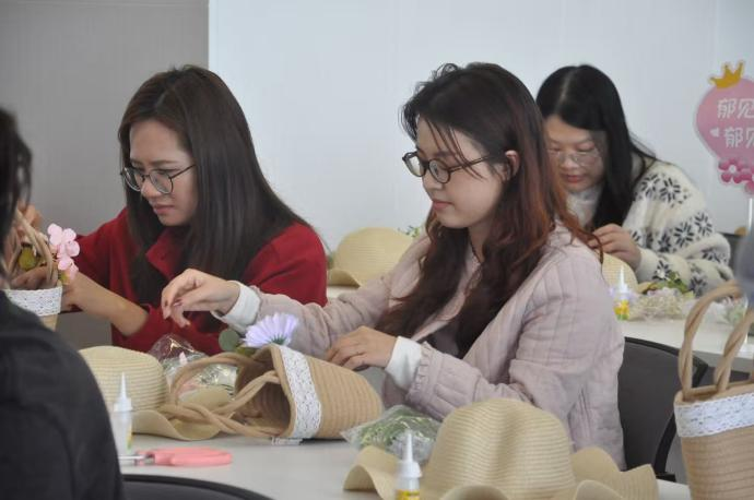 阳光洒落,花香满室。平日里握着粉笔、敲击键盘的手,此刻轻轻拈起花枝。素净的草帽、质朴的草编包,在老师们的巧手下渐次绽放——淡雅的桔梗、灵动的尤加利叶错落其间,普通的物件瞬间有了生机。这不仅是一场美的创作,更是一场心灵的放松。当指尖触碰花朵的柔软,时光仿佛慢了下来。老师们沉浸其中,将春天戴在头上、挎在肩头,也把这份明媚带回了日常。