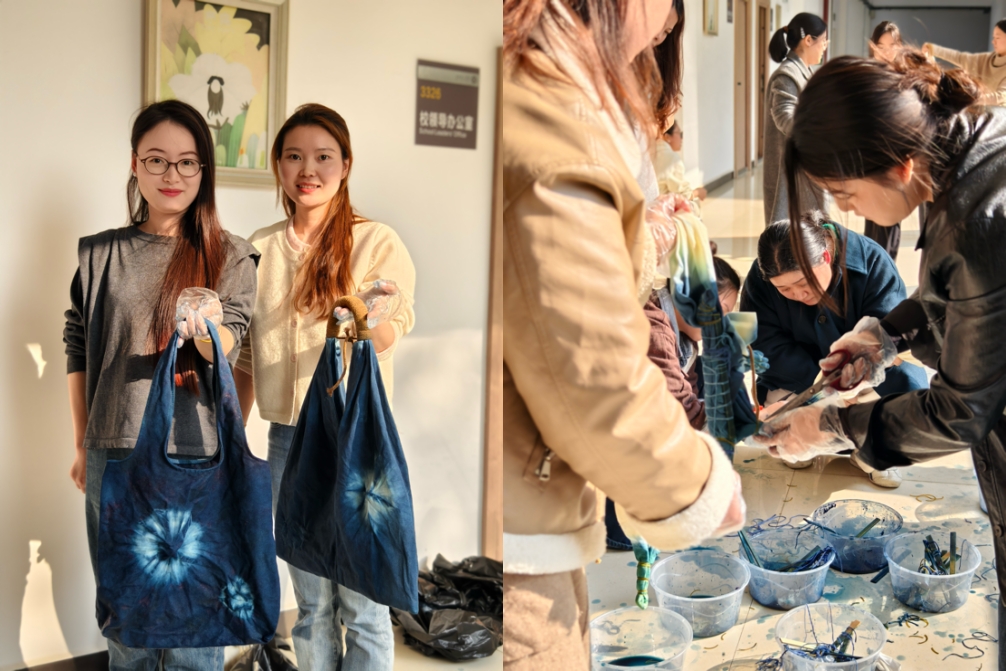 在桂林校区,一场“妙手生花”的扎染体验活动,正在用另一种方式诠释女性的创造力。当素白的布料在指尖折叠、捆扎,当染料在布面上晕染出不可复制的花纹,每一位参与者都在惊叹于自己双手创造出的奇迹。蓝与白的碰撞,传统与现代的交融,正如每一位女性身上多元而独特的魅力。活动现场还准备了精致的茶歇,老师们在创作之余,品一口清茶,与同事们聊聊生活与工作,享受难得的悠闲时光。